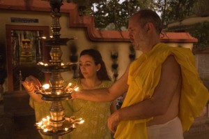 Lighting auspicious lamps in South India, with Tulsi, New Years 2006