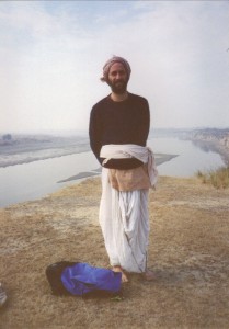 A young dhoti and sweater clad Shyamdas by a body of water, likely Yamunaji