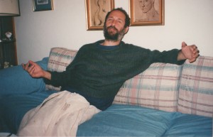 Another classic Shyamdas pose. Seems like a theme; this is one of a number of photos in which he seems to be giving some kind of invisible hug. The man was in the bhava, what more can we say.