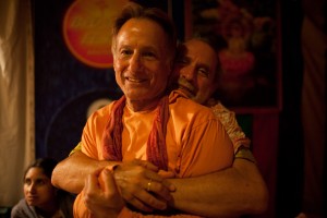 Shyamdas hugs his friend Shridhar at a Bhakti Fest event